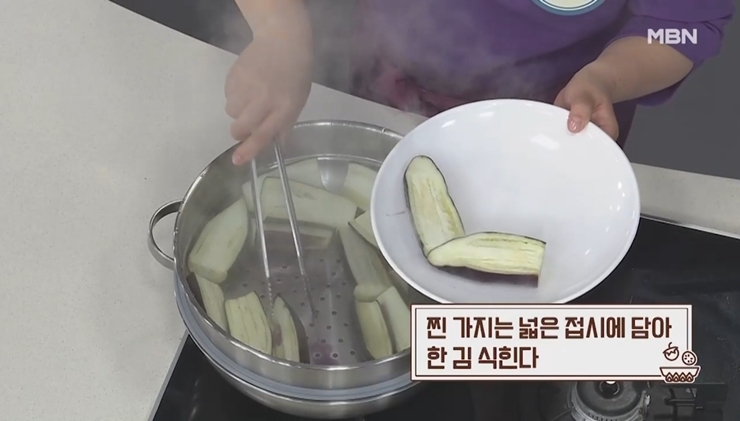 3. 김이 오른 찜기에 가지 껍질이 아래로 향하도록 놓습니다. 가지무침 만드는법 양념장 황금레시피 두 번째 비법! 이렇게 하는 이유는 가지를 찌는 과정에 단맛이 빠져나가지 않기 때문인데, 무침용 가지는 한번 쪄내야 가지 본연의 단맛이 상승한다고 합니다. 또한 덜 무르고 살캉살캉한 식감을 그대로 살릴 수 있다는 장점도 있습니다.
