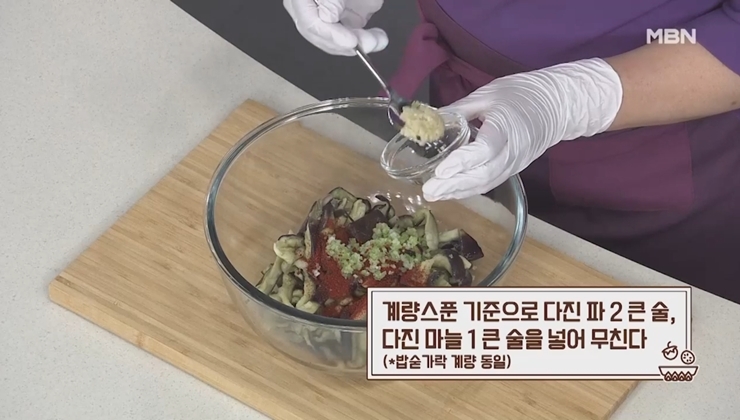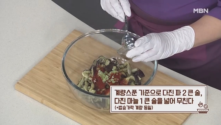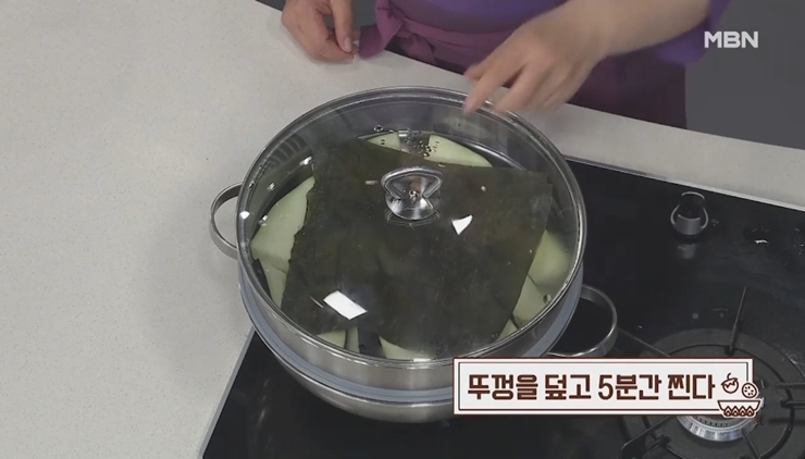 가지무침 만드는법 양념장 황금레시피 3번째 비법이예요. 다시마를 덮어서 가지무침을 미리 쪄내는 것인데 이렇게 하면 다시마의 감칠맛과 단맛이 가지 속에 스며들어 가지의 향과 감칠맛을 함께 올려준다네요.