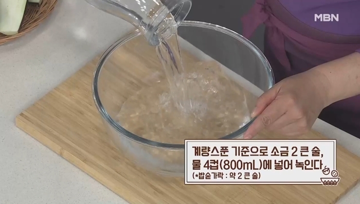 1. 먼저 가지를 손질해서 찌는 것이 가지무침 만드는법 양념장 황금레시피의 첫 번째 단계입니다. 볼에 물 4컵을 담고 소금 2큰술을 넣어 소금을 녹여 주세요.