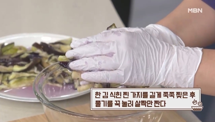 7. 가지 본연의 단맛을 위해 겉도는 물기만 살짝 짜냅니다. 이렇게 하는 이유는 가지를 찌고 나면 물기가 많이 생기기 때문인데 그렇다고 너무 꼭 짜내면 가지의 단맛이 다 빠져나가 뻣뻣하게 될 수 있으니 물기는 적당히 제거해 주세요.