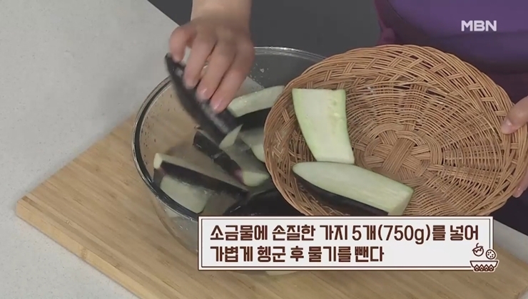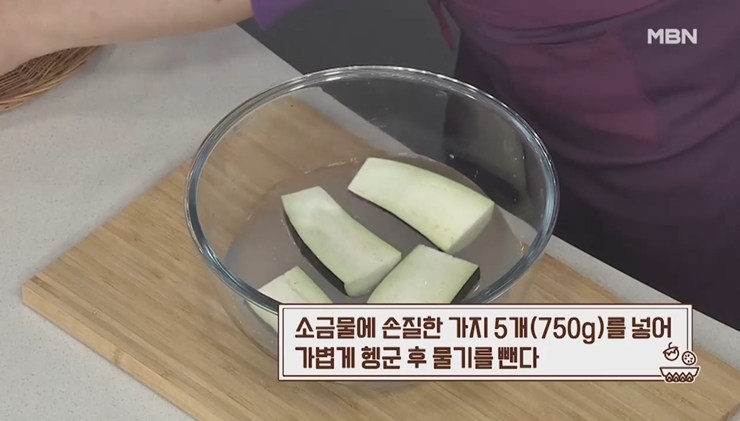 가지무침 만드는법 양념장 황금레시피의 비법 한 가지는 이렇게 소금물에 헹궈주는 것인데요, 이렇게 하면 가지를 찜기에 쪘을 때 가지 속살에 보라색 물이 들지 않는다고 해요.