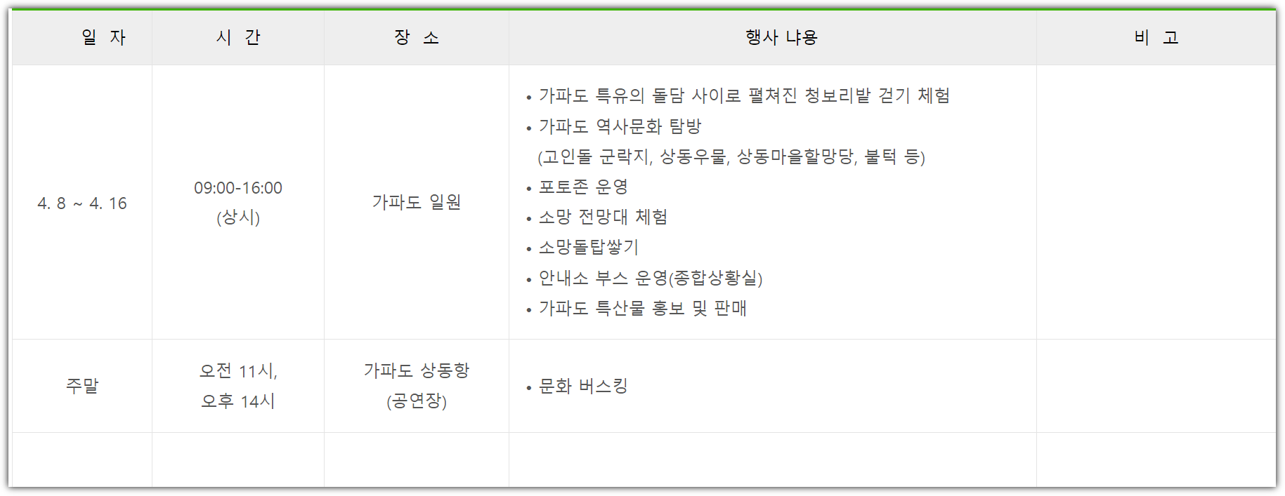 축제 기간 중 방문객의 원활한 이동을 위해 하루 7회 왕래하는 선박이 축제 기간 16회로 늘어나는 등 선박편이 증편 운영된다고 하니 참고하시기 바라구요, 2023년 가파도 청보리축제를 자세히 소개해 드리도록 하겠습니다.