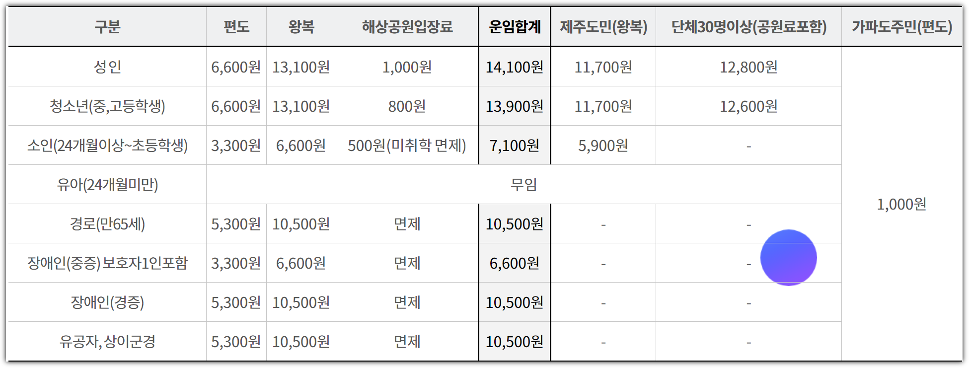 ※ 운항요금(왕복) : 성인 13,100원 / 청소년 12,900원 / 소인 6,600원