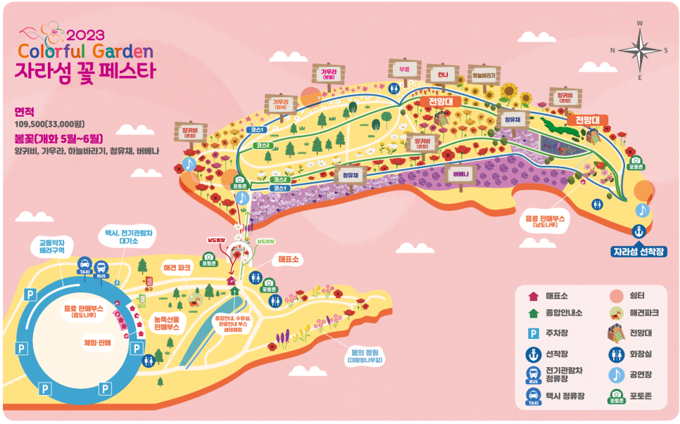 지금까지 가평 자라섬 꽃축제 기간 (2023 자라섬 남도 꽃정원 가는길)을 총정리했습니다. 가평 자라섬 남도 꽃 페스티벌은 올해 경기 관광 축제로 선정됐습니다. 또한 자라섬은 2023∼2024년 한국 관광 100선에도 이름을 올렸는데요, 꽃 개화상황을 보면 아직 봄꽃을 구경하기엔 이른 분위기라고 해요. 자라섬남도 꽃축제의 메인이라 할 수 있는 꽃양귀비는 크게 세 구역(자라섬 남도연결교량입구, 중앙정원가는길, 메인정원)에 걸쳐 조성되고 있는데 지금은 새싹들이 나온 정도구요, 개화는 오는 5월 셋째주부터 시작될 것으로 예상되고 있으니 참고하시기 바랍니다.