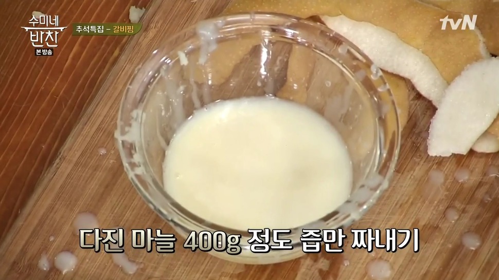 3. 마늘 400g, 배 1개, 생강 1톨을 준비해주세요. 믹서기 혹은 강판에 재료를 갈아 주고 잘 갈아진 재료들은 면포에 넣고 최대한 짜서 즙으로 만듭니다.