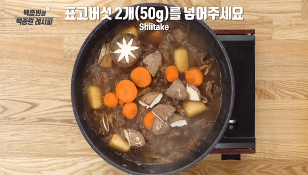 16. 고기를 젓가락을 찔러보았을 때, 어느정도 잘 들어간다 싶으면 적당히 익은 것 인데요, 고기가 적당히 익었다면, 무, 당근, 표고버섯을 넣어주세요.