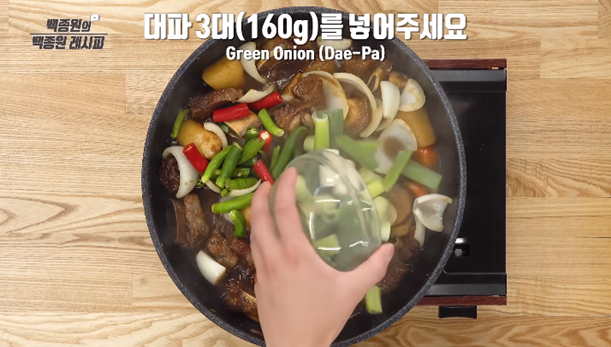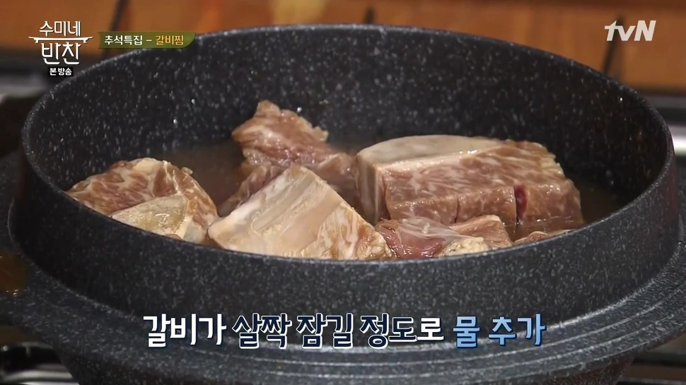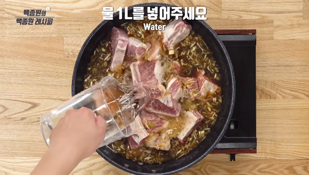 13. 갈비가 살짝 잠길 정도로 물을 부어주세요. 맛을 본 뒤 간장을 추가합니다.