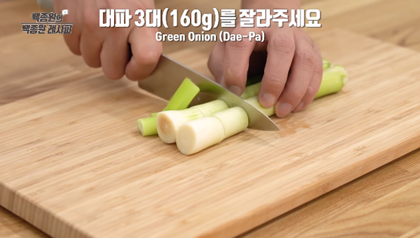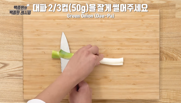 2. 다음은 재료를 손질하고 양념을 준비할 차례입니다. 대파 2/3컵(50g)을 잘게 썰어줍니다.