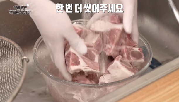 6. 소갈비 2kg를 체에 밭쳐 핏물을 제거합니다.
