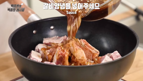 12. 그 위로 재워둔 갈비를 양념장과 함께 넣어주세요.