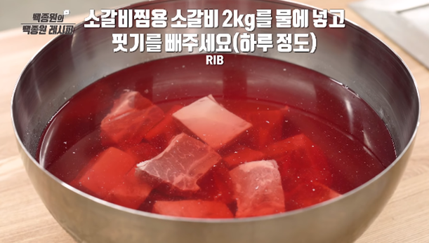 1. 먼저 갈비찜 맛있게 만드는 법 김수미 소갈비찜 황금레시피에서는 갈비를 10대 정도 사용하였어요. 갈비는 물에 몇 시간동안 담가두고 핏물을 깨끗하게 빼냅니다.