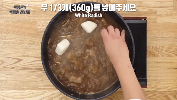 12. 이제 갈비찜에 채소를 넣을 차례입니다. 무 1/3개(360g)를 넣고 잘 익혀줍니다.