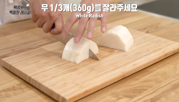 6. 무 1/2개 정도를 2~2.5cm 두께로 잘라 주세요.