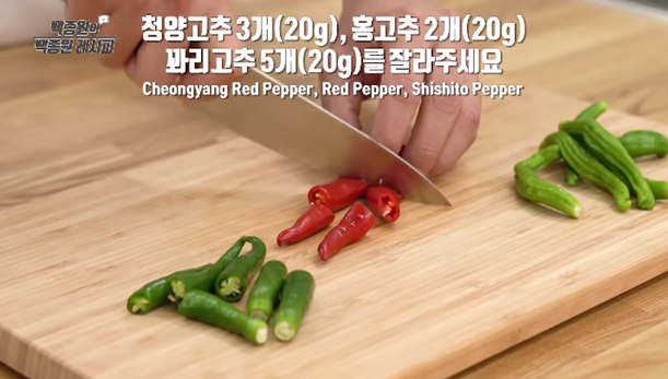 15. 청양고추3개(20g), 홍고추2개(20g), 꽈리고추5개(20g), 대파 3대(160g)를 넣고 잘 익혀줍니다.