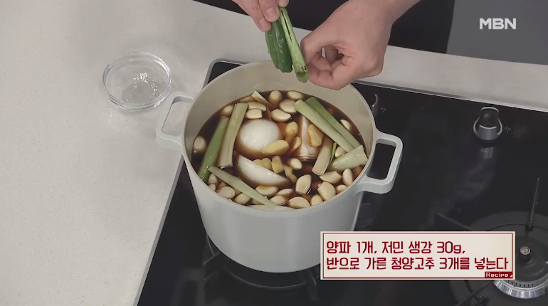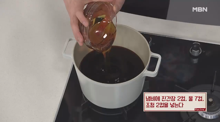 재료 : 진간장 2컵, 조청 2컵, 물 7컵, 맛술 3컵, 대파 50g, 통마늘 300g, 양파 300g(1개), 저민생강 30g, 청양고추 3개, 사과 200g(1개), 오렌지 200g(1개), 통후추 2큰술