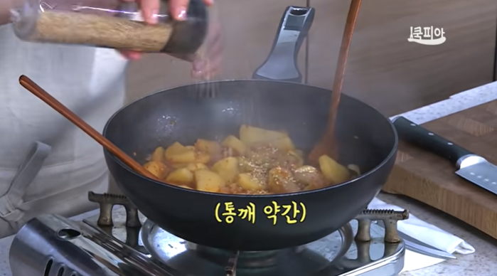 ▶ 감자를 넣고 10여분간 더 끓여 거의 국물이 졸아들면 참기름, 통깨, 깻가루를 넣어 완성합니다.