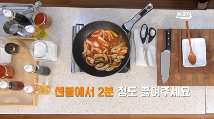 ▶ 조림 양념이 끓어오르면 썰어 놓은 양파와 대파를 넣고 2분간 끓입니다.