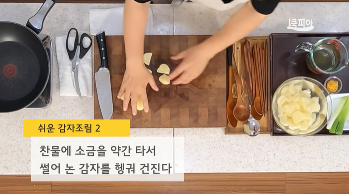 ▶ 찬물에 소금을 약간 타서 썰어 논 감자를 헹궈 건집니다.