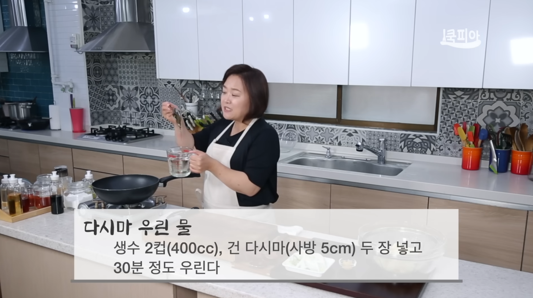 ▶ 생수 2컵(400cc), 건 다시마 (사방 5cm) 두장 넣고 30분 정도 우립니다.
