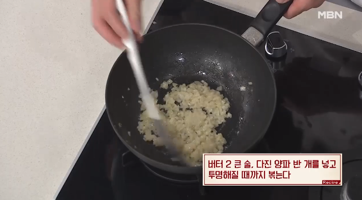 3. 버터 2큰술과 다진 양파 반 개를 넣고 투명해질 때까지 볶습니다.
