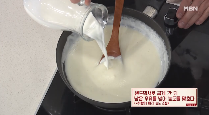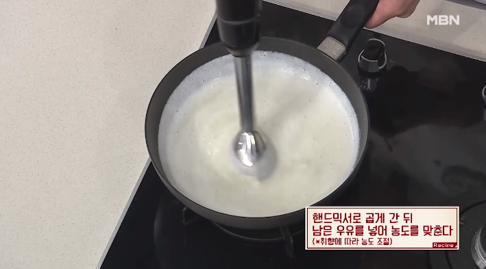 6. 핸드믹서로 곱게 간 뒤 남은 우유를 넣어 취향에 따라 농도를 조절합니다. 우유를 추가하셨다면 다시 한소끔 더 끓여주시는 것이 좋아요.