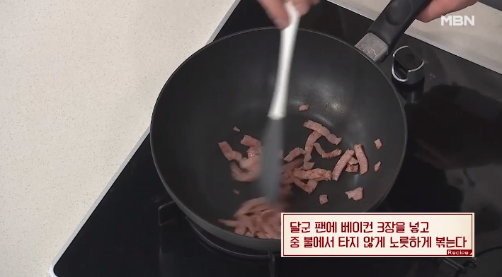 1. 달군 팬에 베이컨 3장을 넣고 중불에서 노릇하게 볶아주세요.