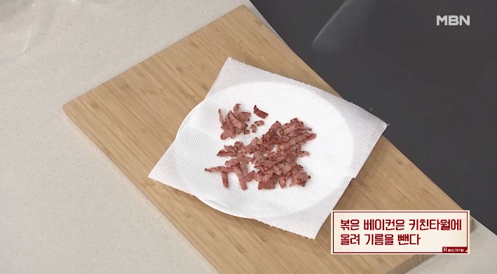 2. 볶은 베이컨은 타월에 올려 기름을 빼주시는 것이 좋아요.