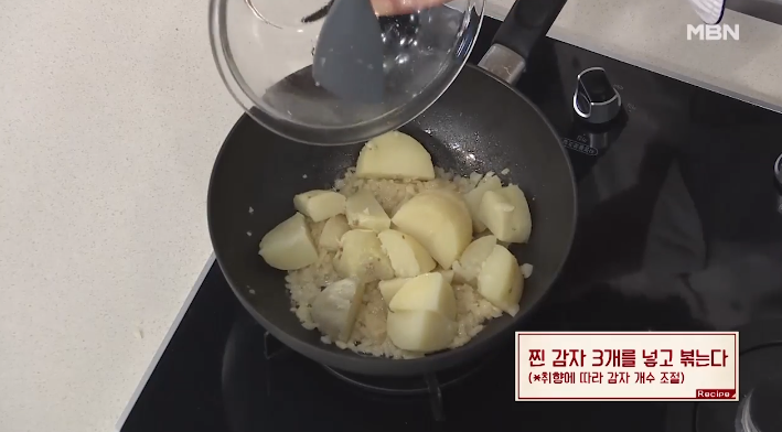 4. 찐 감자 3개를 넣고 볶아 주세요.
