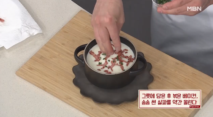 7. 마지막으로 소금과 후춧가루로 간을 한 뒤 그릇에 담아 미리 준비한 베이컨과 송송 썬 실파를 약간 올리면 감자 수프 만들기도 완성됩니다.