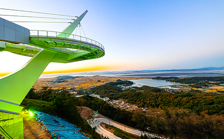 화개산 전망대는 교동도의 모든 전망이 한눈에 내려다보이는 곳으로 투명한 유리 위를 걷는 스카이 워크가 가능한 랜드마크입니다. 전망대 에서 내려다 보면 북쪽으로는 화개정원을 비롯하여, 고구저수지, 교동벌판, 북한의 연백평야까지 볼 수 있구요, 남쪽으로는 석모도, 볼음도 등 수려한 강화의 다도해 경관 조망이 가능합니다.