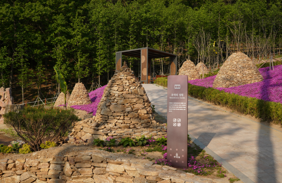● 추억의 정원 : 핑크색 꽃밭이 뒤덮은 고향 땅의 시골 풍경을 담아 산지나 구릉지에 형성된 계단식의 다랭이 정원