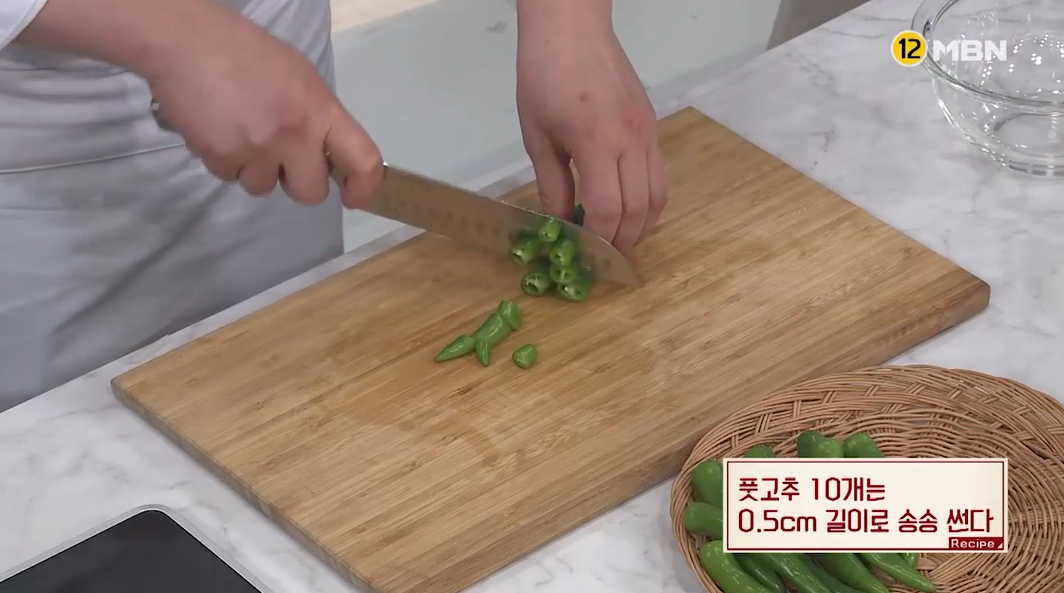 2. 풋고추 10개는 0.5cm 길이로 송송 썰어 주세요.