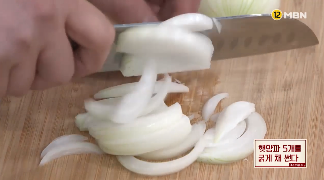1. 먼저 장아찌 재료를 손질해야 합니다. 햇양파 5개를 굵게 채썰어 주세요.