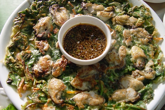 재료: 굴 반 컵, 부침 가루 3~4 큰 술, 달걀 2개 푼 물, 마늘즙 1 큰 술, 송송 썬 달래, 송송 썬 청양고추•홍고추