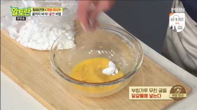 5. 굴의 수분이 부침가루를 흡착시켜 달걀옷이 잘 벗져지지 않기 때문에 부침가루 속 굴은 바로 꺼내지 마세요.