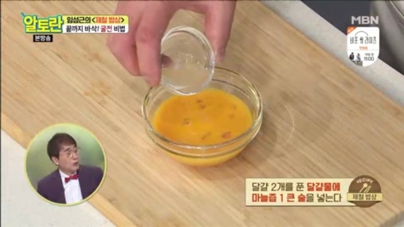 6. 달걀 2개를 푼 달걀물에 마늘을 갈아 면포에 즙을 짜서 만든 마늘즙 1 큰 술을 넣습니다.