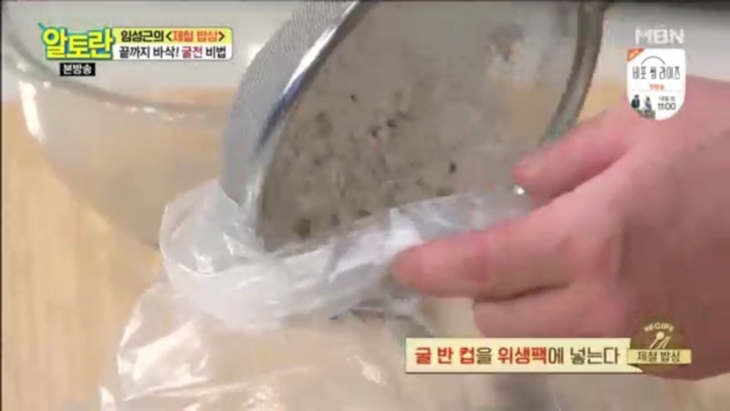 4. 위생팩에 굴을 넣고 굴이 깨지지 않게 살살 흔들어 줍니다.