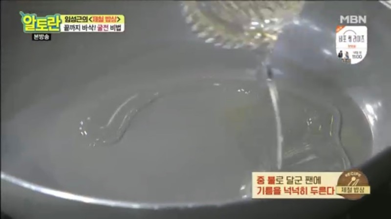 8. 달군 팬에 기름을 넉넉히 두릅니다.