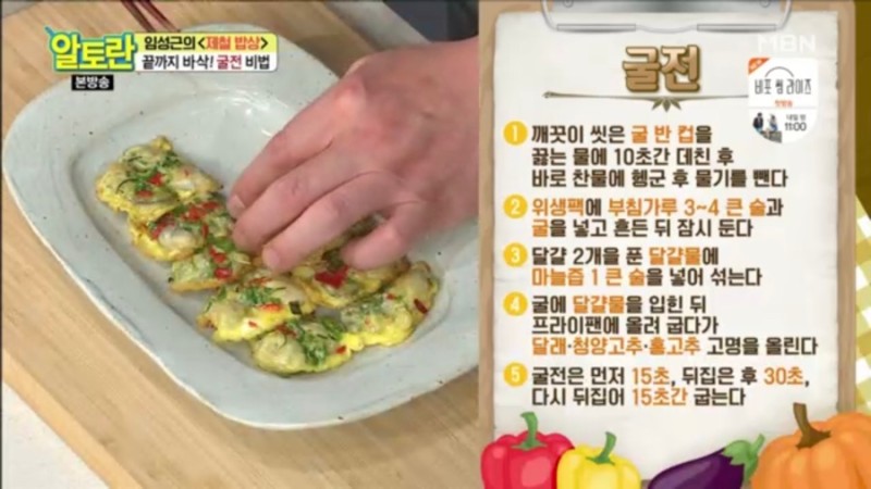 11. 송송 썬 청양고추•홍고추를 굴전 위에 올린 후 15초간 굽습니다.