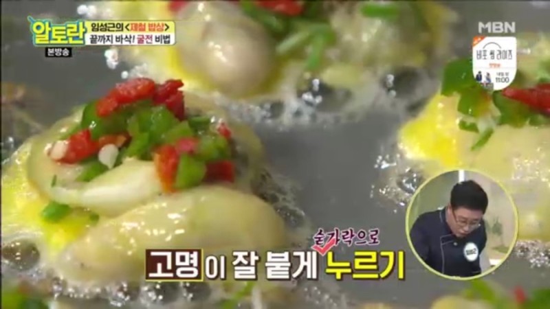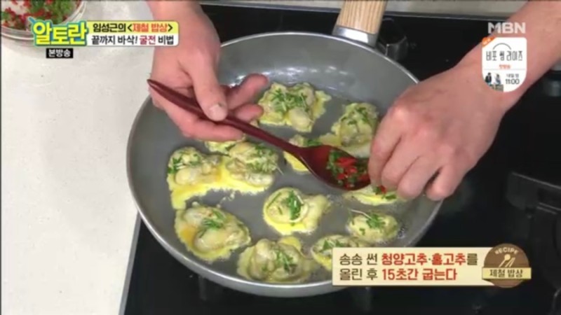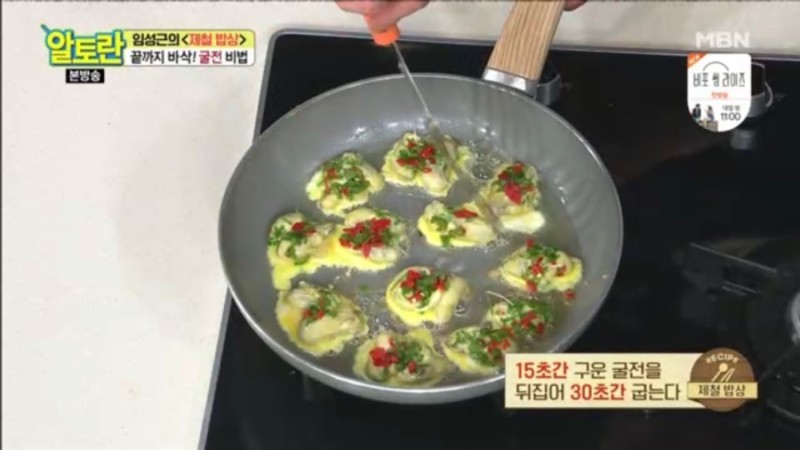 12. 굴전을 올리고 15초 지나면 뒤집어 30초 굽습니다.