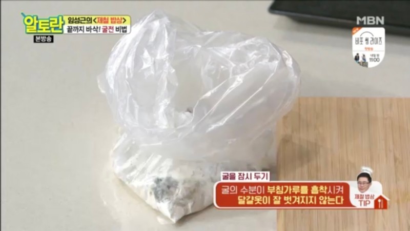 5. 굴의 수분이 부침가루를 흡착시켜 달걀옷이 잘 벗져지지 않기 때문에 부침가루 속 굴은 바로 꺼내지 마세요.