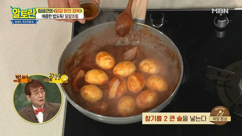 3. 반으로 졸인 양념장에 반숙달걀 10개를 넣고 2분간 조린 후 참기름 2 큰 술을 넣은 후 불을 끕니다.
