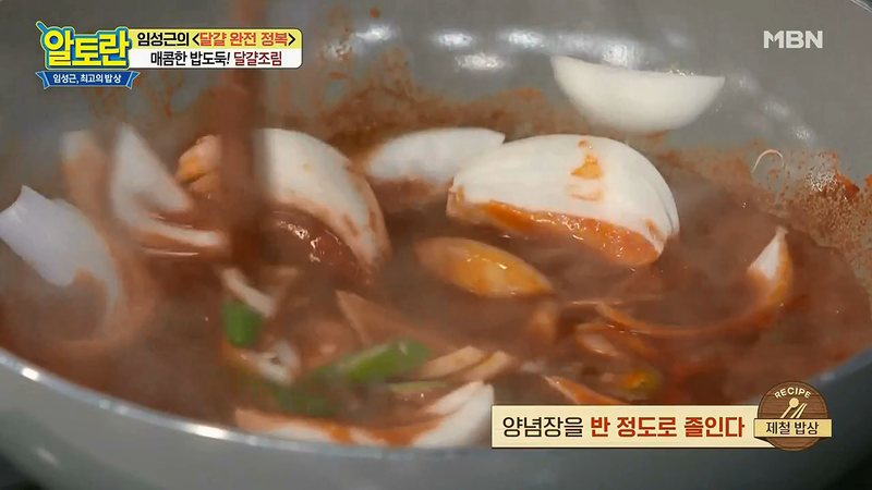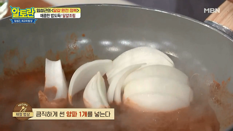 2. 양념장이 끓으면 큼직하게 썬 양파 1개, 어슷 썬 청양고추 3개를 넣고 양념장이 반으로 졸을 때까지 끓입니다.