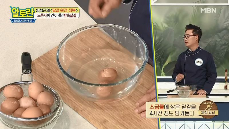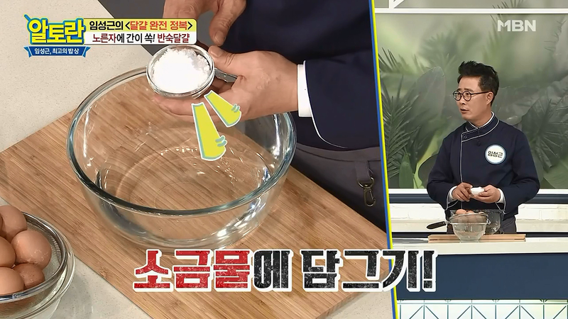4. 물 4컵에 꽃소금 5큰술을 넣고 잘 녹인 후 삶은 달걀을 4시간 이상 담가둡니다.