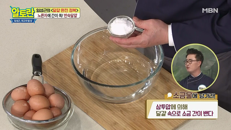 4. 물 4컵에 꽃소금 5큰술을 넣고 잘 녹인 후 삶은 달걀을 4시간 이상 담가둡니다.