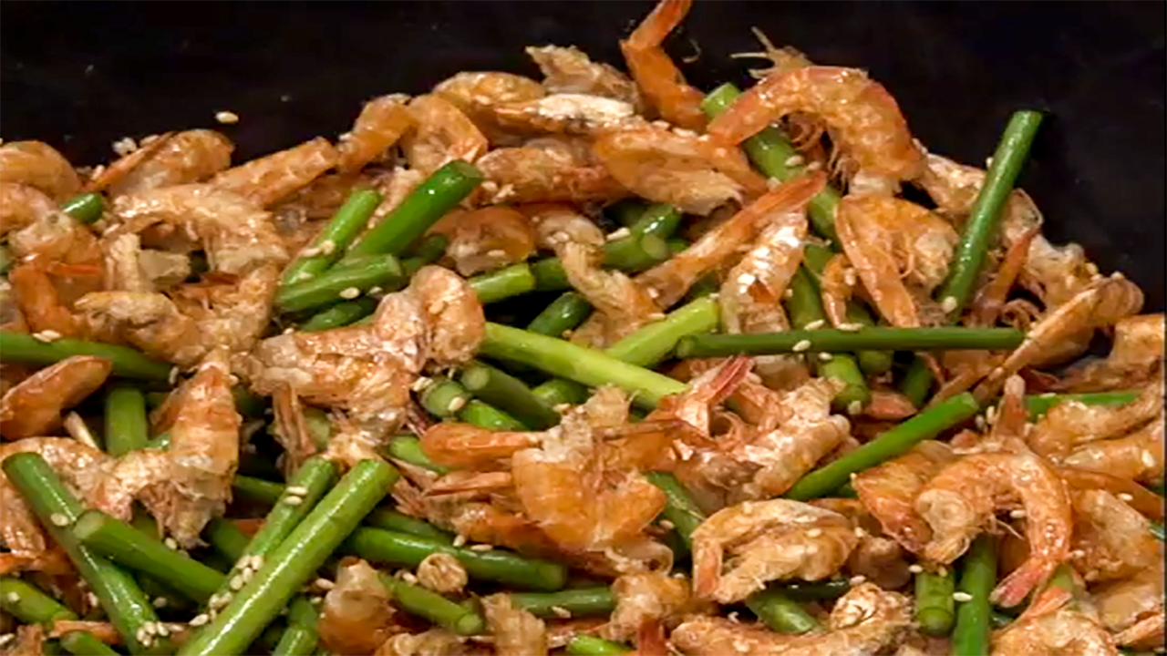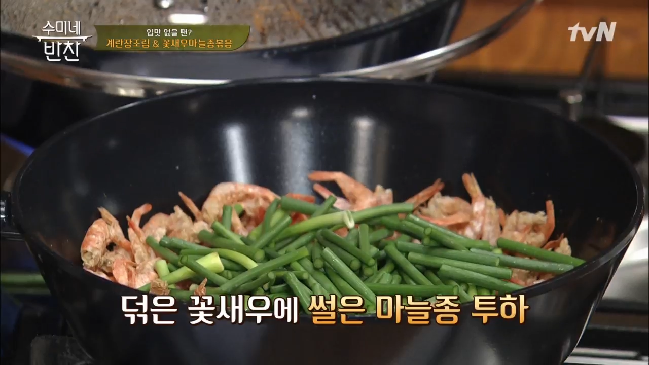 5. 이제 덖은 꽃새우에 미리 손질한 마늘쫑을 넣어주는데 먹고 싶은 만큼 적당량을 넣고 약불에서 약 3분 정도 함께 볶아줍니다.