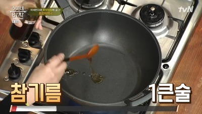 2. 팬을 달군 후 참기름 1큰 술, 국간장 2큰 술을 넣고 팬에 미역을 넣고 볶습니다.