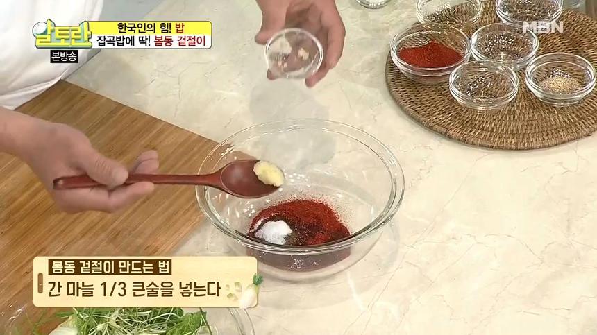 10. 간 마늘 3분의 1큰술, 소금 3분의1큰술, 물엿 1큰술을 넣어줍니다. 이렇게 넣은 양념들을 잘 섞어주면 봄동 겉절이 황금레시피 양념장 만드는법은 완성이예요.
