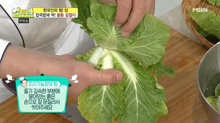 4. 봄동 겉절이 황금레시피 오늘의 팁을 알려드리면 줄기 깊숙한 부분에 묻어있는 흙은 손으로 잘 문질러서 씻어주셔야 해요. 손질한 봄동은 찬물에 3~4번 깨끗이 씻어 물기를 제거해주세요.