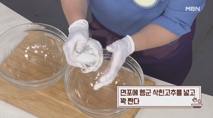 삭힌고추 300g을 찬물에 넣고 헹궈낸 후 건진 후 소금끼를 빼기 위해 면포에 헹군 삭힌고추를 넣고 꽉 짜주세요.